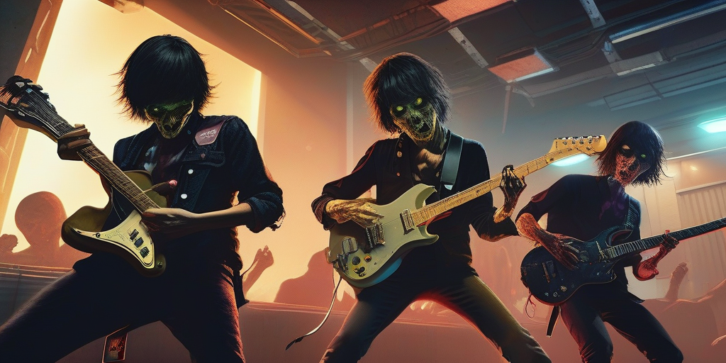 念願叶ってライブ会場にたどり着いたエースは、ギターウルフのメンバーたちと運命的な出会いを果たします。彼らの熱狂的なライブが終わった直後、状況は一変。空からUFOが飛来し、街中にゾンビが溢れ出すという、まさに地獄絵図に!